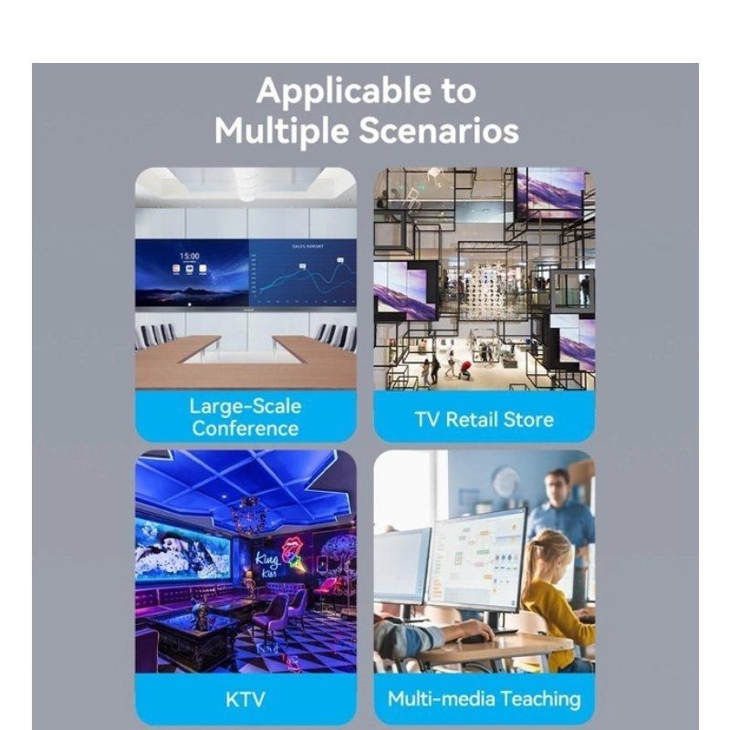 " El Splitter 4K 60Hz Vention HDMI 1x8 (AKQB0-EU) está diseñado para 'transmitir señales HDMI de audio y vídeo digital desde una fuente HDMI '(ordenador, reproductor multimedia, reproductor de DVD, portátil, etc.) 'simultáneamente a 8 dispositivos con entrada HDMI (TV, plasma panel, 'proyector, monitor, etc.).''El divisor también aumenta la transmisión de señal hasta 30 metros, lo 'que permite longitudes de cable más largas (hasta 15 metros desde la 'fuente hasta el divisor y hasta 15 metros desde el divisor hasta la 'pantalla).''' Especificaciones' Números de puertos de salida: 8' Compatibilidad con resolución 4K "