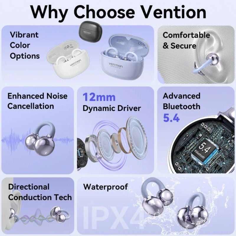 "Auriculares Deportivos Bluetooth Vention Open Ear OpenBeat Echo Clip A1'Especificaciones''' Marca: Vention' Nombre: Auriculares de oído abierto ECHO CLIP A1' Modelo: NBW' Color: Blanco' Versión de Bluetooth: Bluetooth 5.4' Perfiles Bluetooth compatibles: AVRCP/A2DP/HFP/HSP' Códec compatible: SBC/AAC' Material: ABS' Alcance efectivo: 10 m (máx.)' Rango de frecuencia: 2402MHz~2480MHz' Capacidad de la batería de los auriculares: 40mAh/0,148Wh' Potencia de entrada de los auriculares: 5V⎓100mA' Capacidad de la batería del estuche de carga: 400mAh/1,48Wh' Potencia de entrada del estuche de carga: 5V⎓500mA' Interfaz del estuche de carga: USB-C' Garantía: 1 año' Embalaje: Caja a color'"