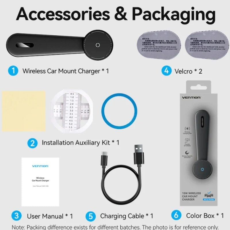 " Cargador de Coche Inalámbrico Vention KSKB0EspecificacionesMarca: VentionNombre: Cargador inalámbrico para coche con soporteModelo: KSKColor: NegroMaterial: Aleación de aluminio-titanio + TPUTipo de montaje: Salpicadero/Consola central/Parabrisas delanteroBase: Adhesivo 3M + VelcroPotencia: 15W máx.Alimentación: USB-C hembraGarantía: 1 añoEmbalaje: Caja a color''''''''''' "