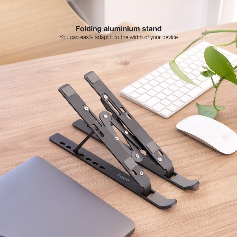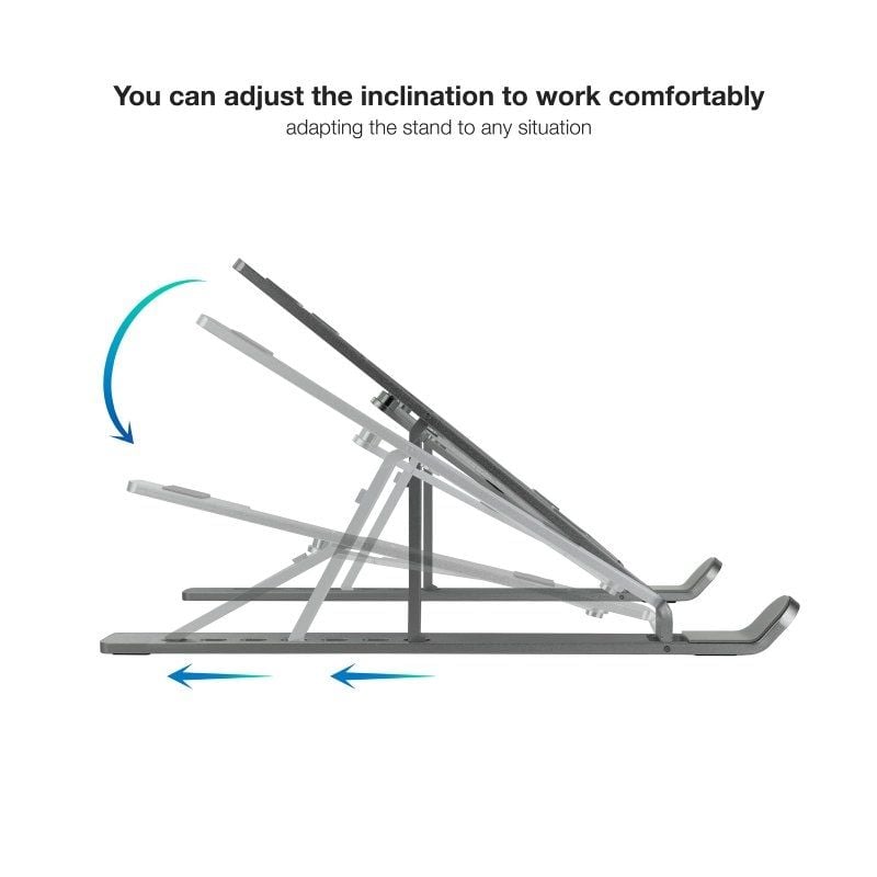 " ' Especificaciones' Diseño plegable, fácil de transportar y de guardar' Dispone de 7 niveles de ajuste de altura' Incorpora almohadillas de silicona para dar mayor estabilidad y evitar arañazos' Mejora la ventilación del portátil' Válido para portátiles de 11”-15”' Peso máximo soportado 5 kg' Color: Gris' Medidas del producto: 253x45x15 (plegado) ' 253x186x148 (desplegado)' Peso neto: 0,22 kg