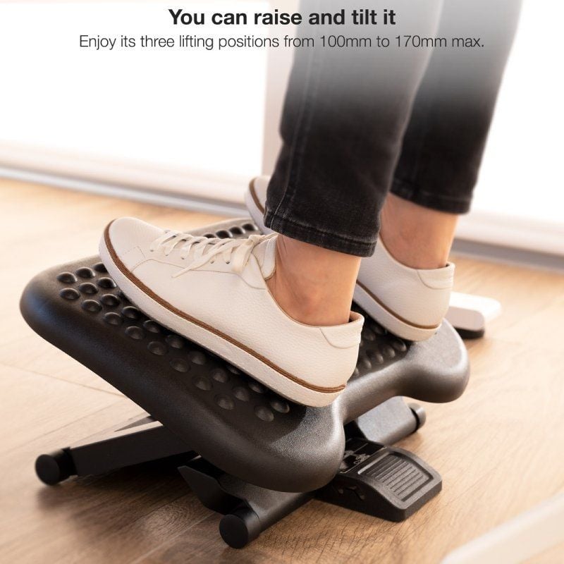 "TQFR0603-BReposapiés Ajustable en Altura e Inclinación, NegroEspecificacionesAjustable en altura e inclinaciónCompletamente plegable, fácil de transportarApto para uso en oficina y en casaPeso máximo soportado: 30 kgRango de regulación de altura: 70-390 mmRango de regulación de inclinación: 0°/18°/30°Goma antideslizante para mayor agarreNOTA: ¡Peligro! no ponerse de pie en el reposapiésMedidas del reposapiés: 460x340x100-170 mmColor: NegroPeso neto: 1,80 kg