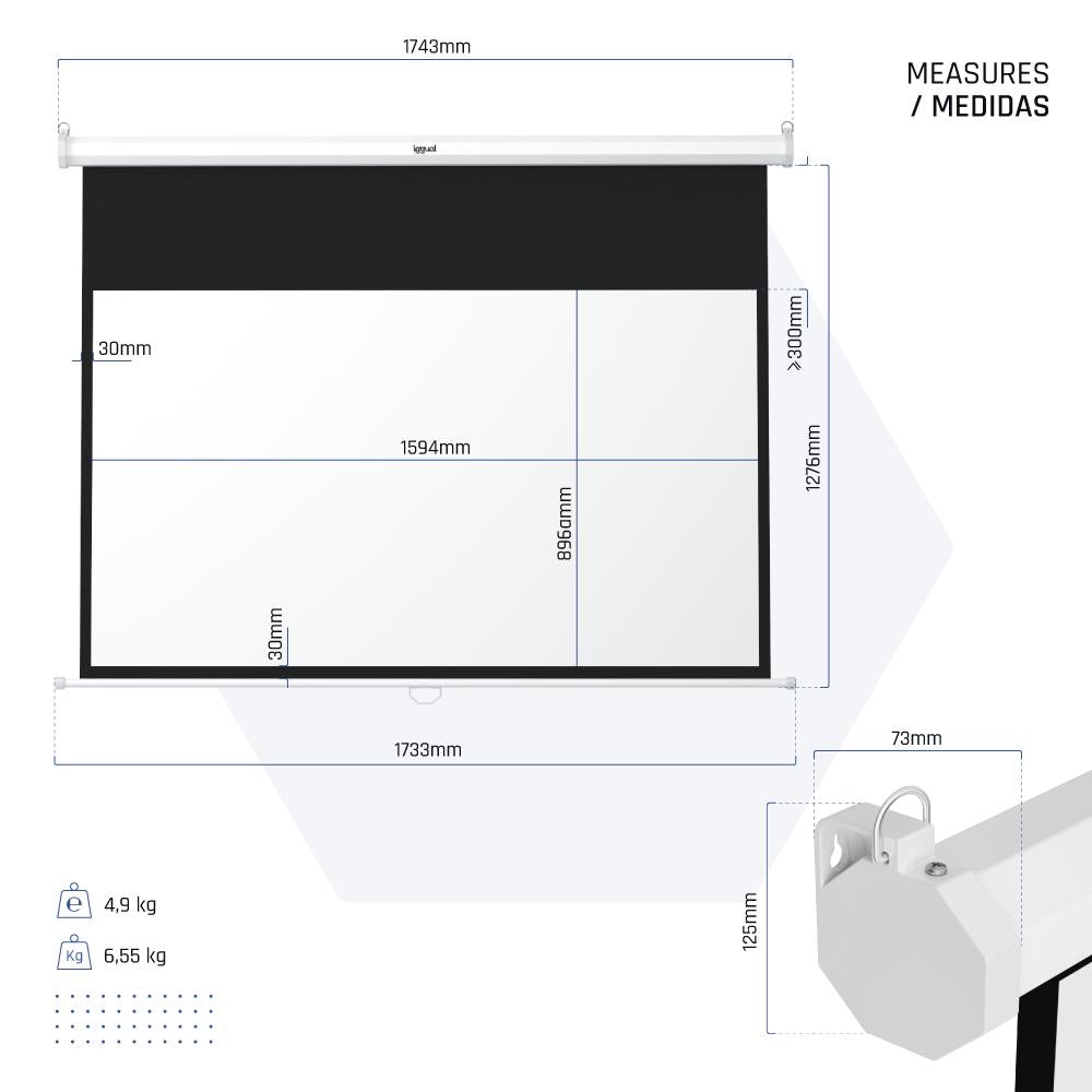 - Ideal para cualquier tipo de proyector, SVGA, XGA, 3D, HD, Full HD y 4KMedidas- Área de visualización: 159 x 89 cm