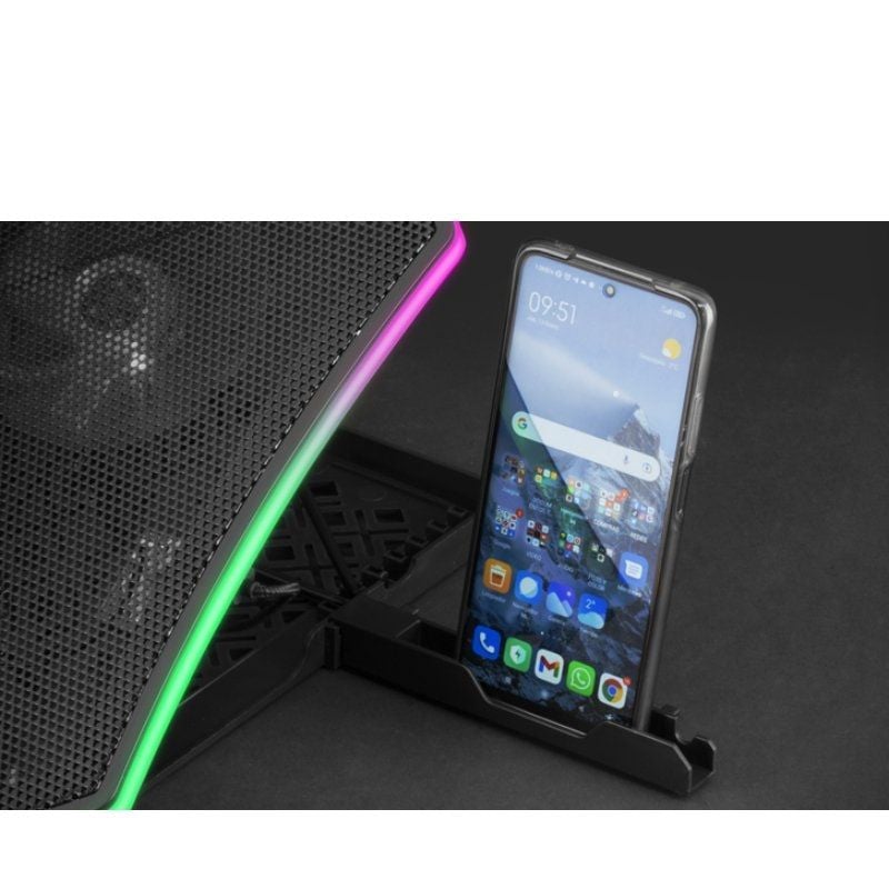 - Equipada con una rejilla especial metálica y una estructura de ABS resistente, la base MNBC6 ofrece un soporte perfecto para portátiles de cualquier tamaño hasta 19", protegiéndolo del sobrecalentamiento gracias a sus 3 grandes ventiladores controlados digitalmente, y proporcionando una superficie antideslizante que te ayude a disfrutar de tus sesiones gaming en cualquier sitio.