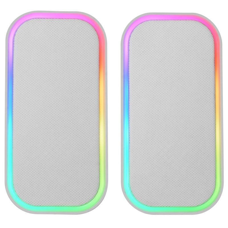 ¡Disfruta de una calidad de sonido superior, sin importar tu equipo!'CARACTERÍSTICAS TÉCNICAS'''Dimensiones'162x81x83mm'Peso'680g'Tamaño'Compacto'Iluminación'RGB Control'Acabado'Mate'Materiales'ABS'Color'Negr/Blanco'Tipo de cable'Recubrimiento de goma'Potencia'20W'Conector'USB alimentación + Jack 3.5mm audio'Drivers'2 Activos'Rango de frecuencia'20Hz-20KHz'Impedancia'4Ω'Control de volumen'Sí'Voltaje'DC 5V'Corriente'1A'Longitud del cable'44cm (altavoz-caja control) 85cm (caja control-USB)'Compatibilidad'PC/Mac/Smartphone/Tablet'Versión Bluetooth'5.3'Distancia de conexión'10m'''CONTENIDO DE LA CAJA''Altavoces y manual de usuario.''"