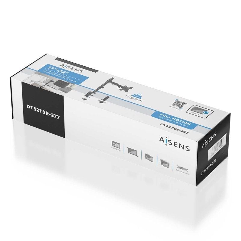 " Soporte para Monitor Aisens DT32TSR-277Especificaciones:Soporte de mesa eco giratorio e inclinable para monitor/TV (3 pivotes, 1 brazo) de 17”-32”Fabricado con acero de alta resistencia y pintado con pintura electrostática para un acabado perfecto.Se permite la instalación en la mesa a través de abrazadera o de tornillo pasanteVESA Máximo: 100x100mm (Compatible con VESA de 75x75, 100x100mm)Carga Máxima: 10kgAngulo de Inclinación: -45º